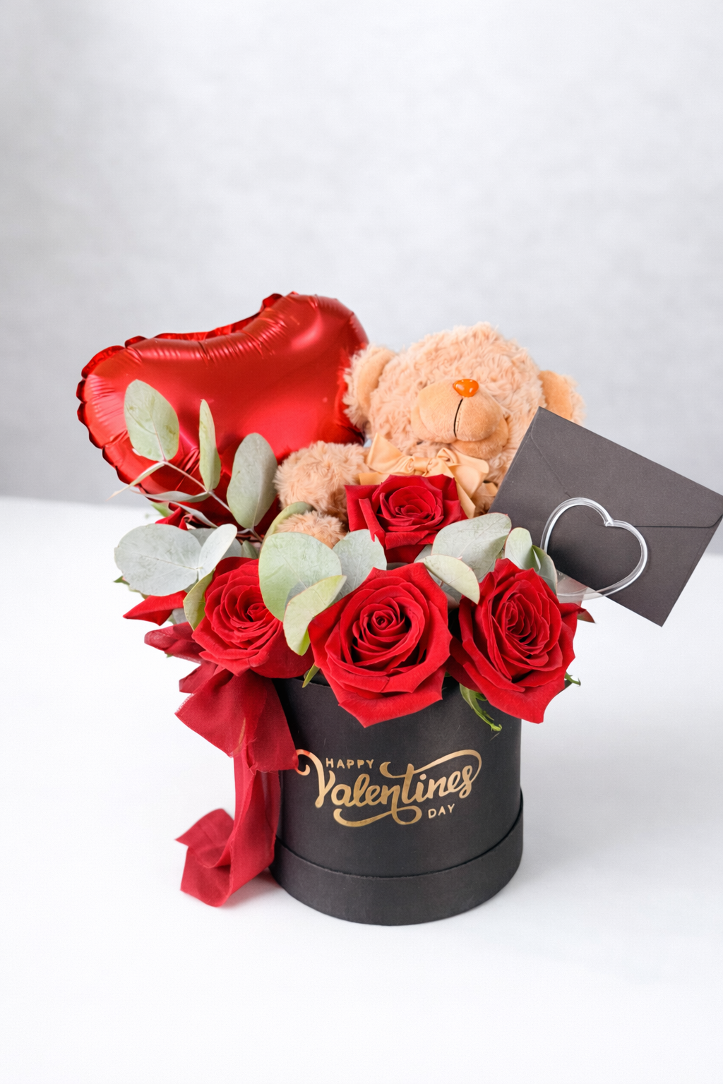 Incluye: 6 rosas naturales y follaje verde, peluche, globo corazón en caja personalizada con temática de san valentín y tarjeta dedicatoria.