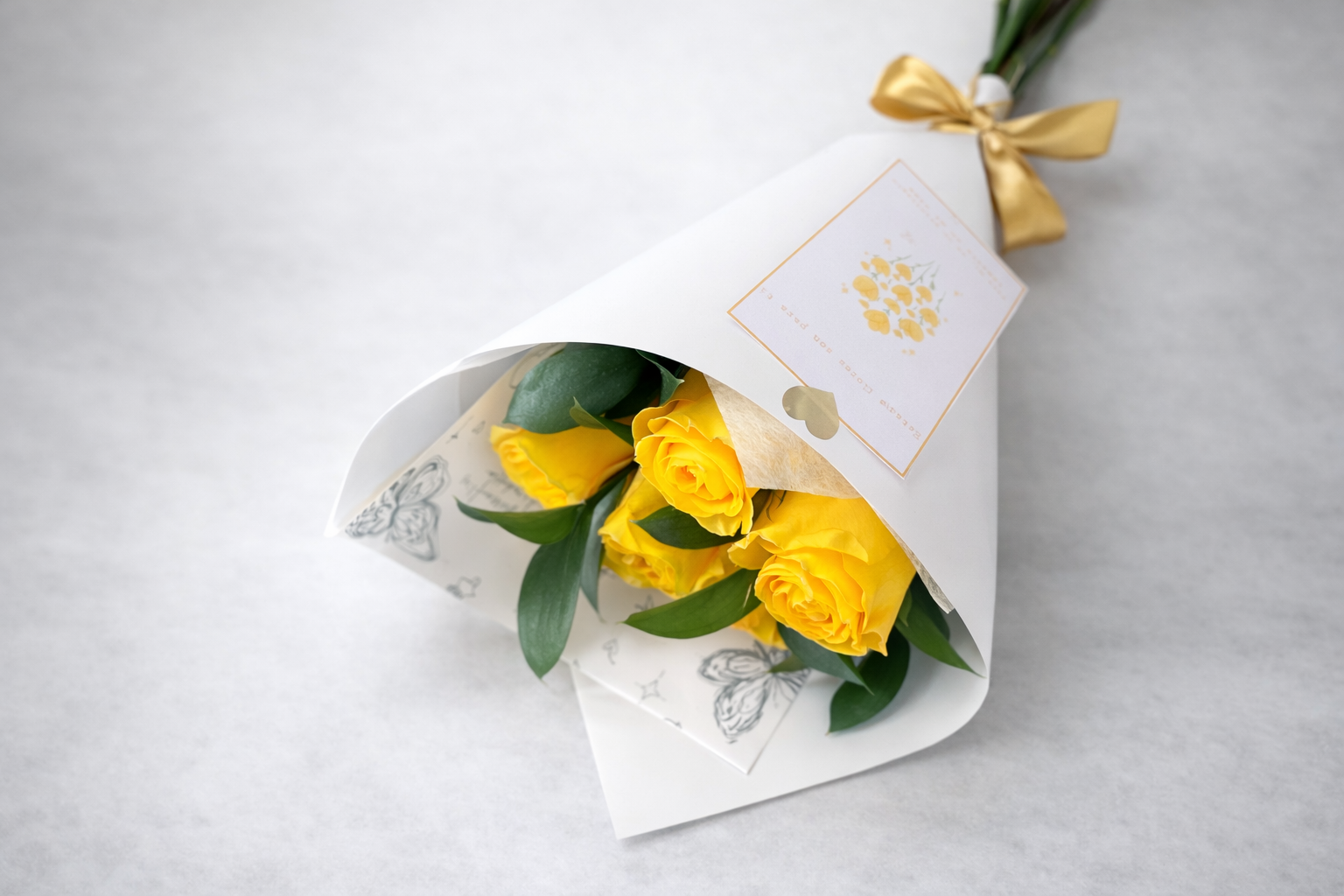 Envuelto en papel floral y mono de cinta de satín.